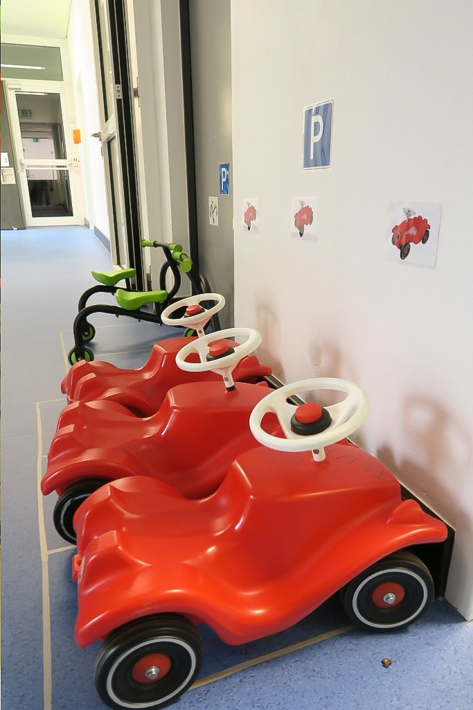 Möglich wurde die Schaffung der fünften Gruppe durch einen baulichen Kniff: Aus einem Teilbereich des Gebäudekomplexes, der bislang von der Klinikschule genutzt wurde, entstand eine richtige kleine Turnhalle, die nicht nur der Kita dient, sondern auch dem Jugendtreff und Gruppen aus dem Quartier offen steht. Im Gegenzug konnte aus dem bisherigen Bewegungsraum der Kita ein neuer U3-Gruppenraum entstehen.